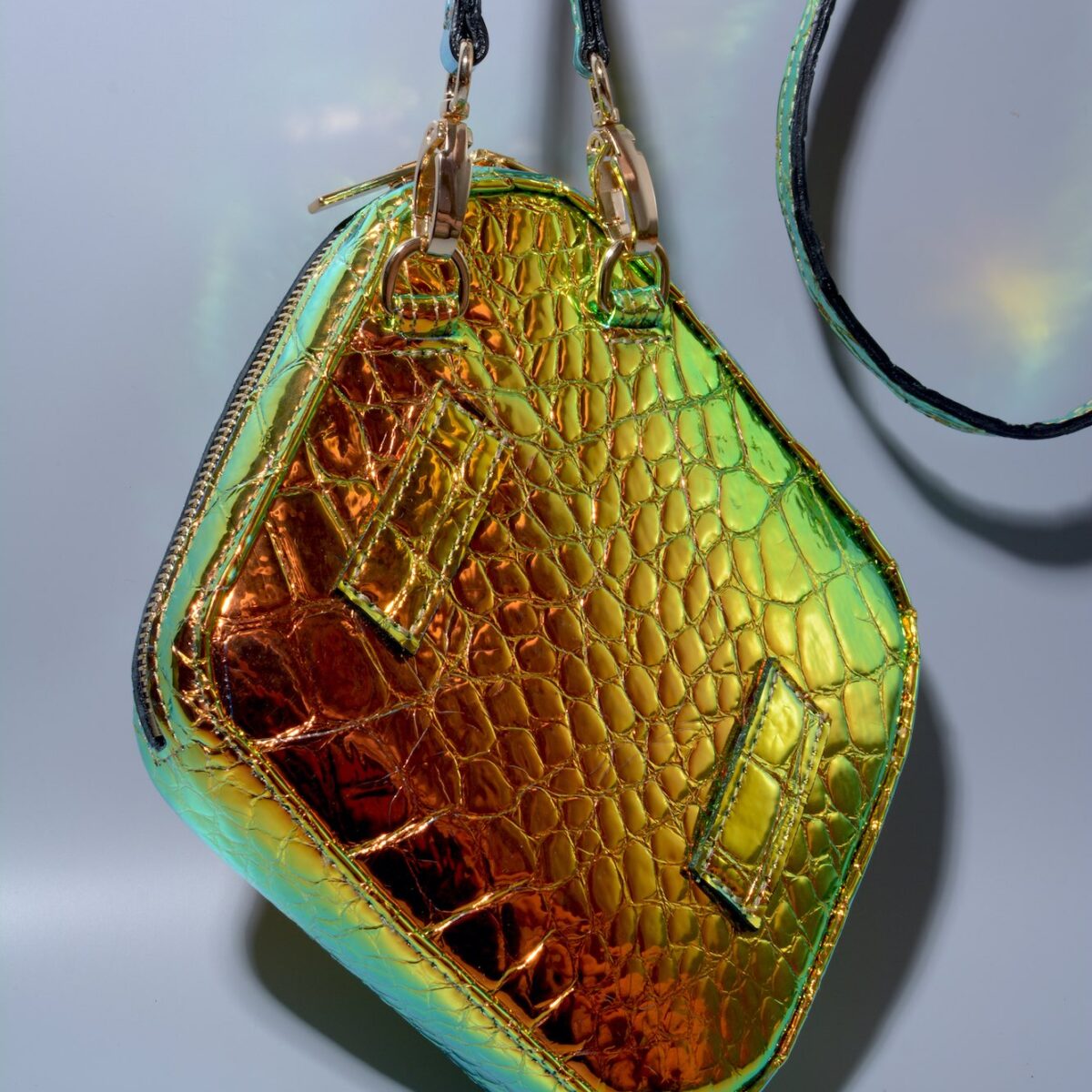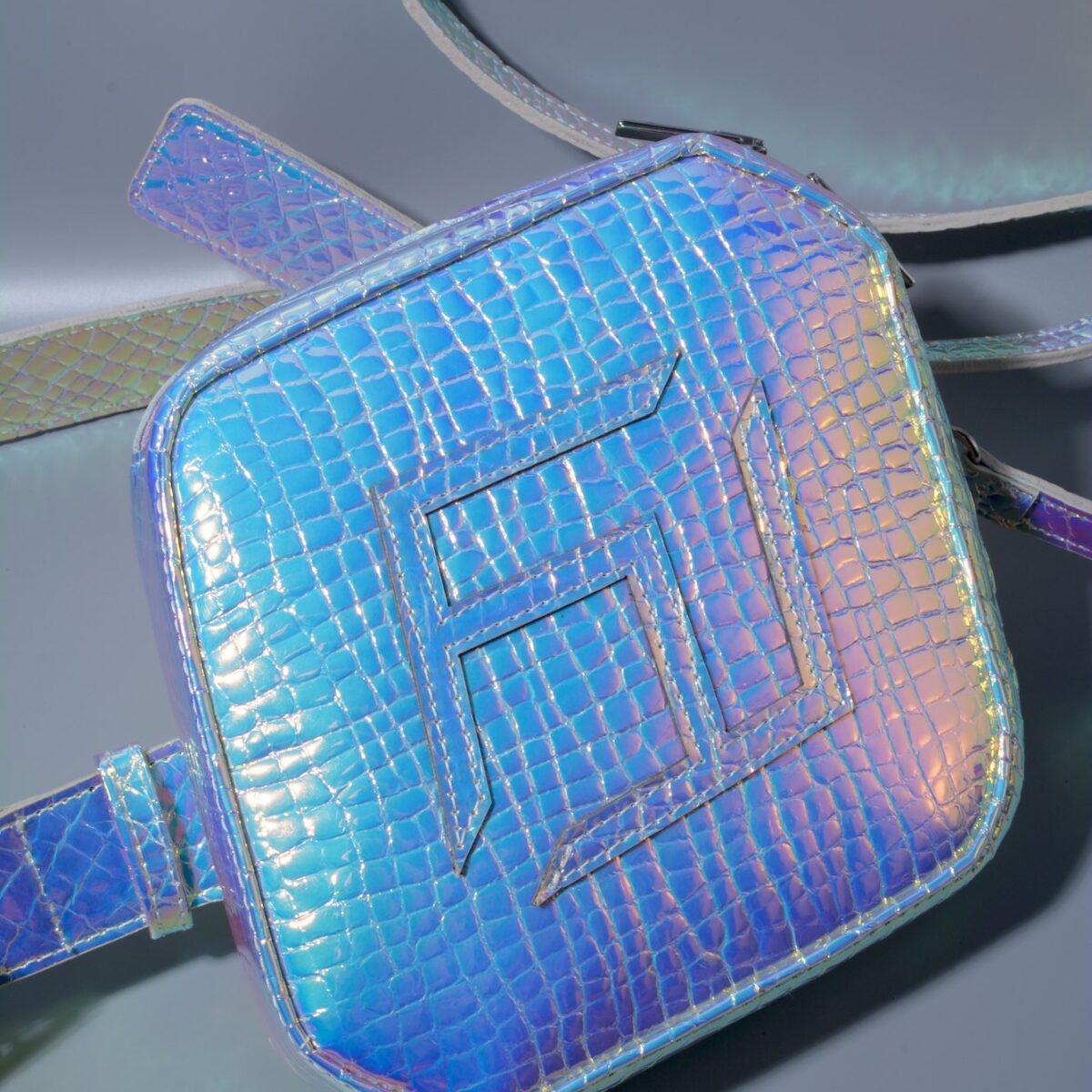 This bag is crafted from croc-effect embossed leather and adorned with laser cut logo. The design is completed by a detachable and adjustable belt and shoulder strap.